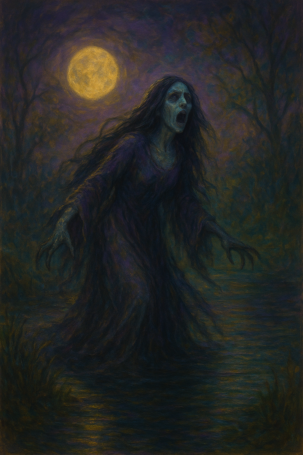 A legendary spirit from Mexican folklore, condemned to wander near rivers mourning her drowned children.
